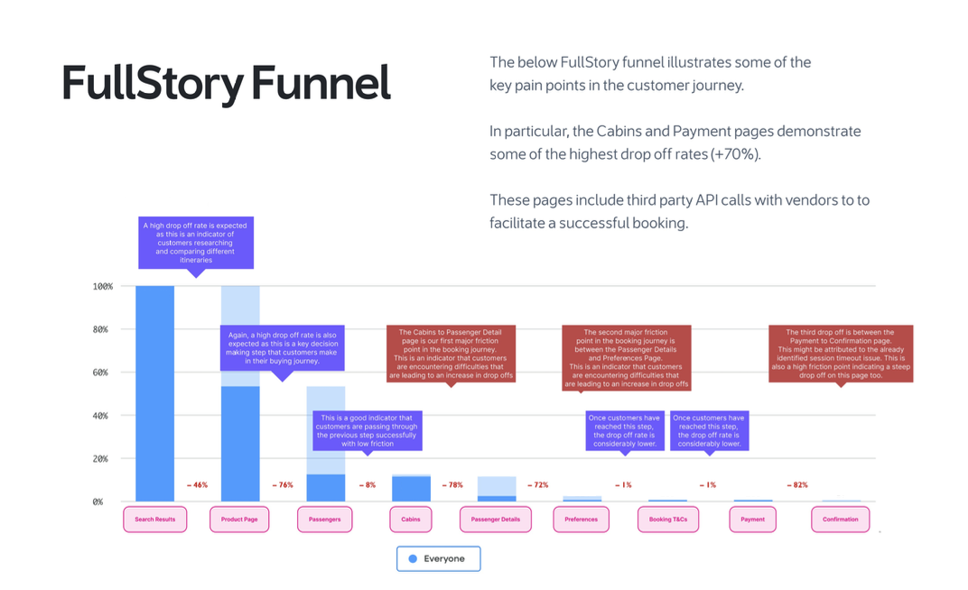 Analysis of the FullStory funnels revealed a significant drop-off (~70%) on the Cabin Selection page. Reviewing session recordings suggested that the current UI and selection process was confusing potential customers, leading many to abandon their bookings.